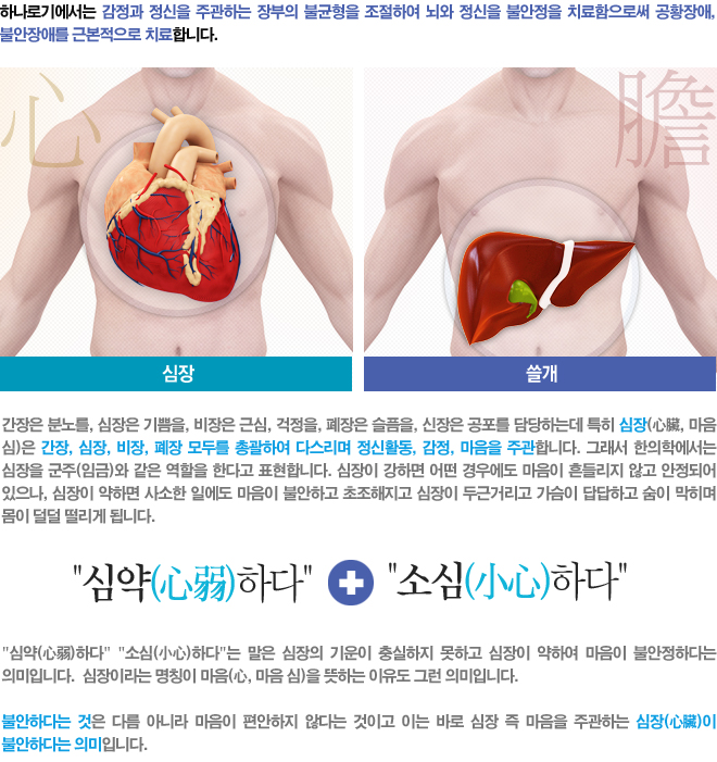 한의학에서는 장부의 불균형을 조정하여 정신의 불안정을 치료함으로써 공황장애를 근본적으로 치료하고자 합니다.
