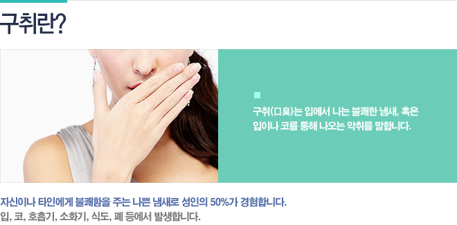 입냄새는 매우 흔한 증상이지만 상대방에게 불쾌감을 일으킬 정도의 악취를 풍기는 심한 구취는 사회생활에 지장을 초래할 수 있어 그 예방법과 치료방법에 관심이 모이고 있다. 특히 고객이나