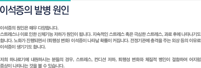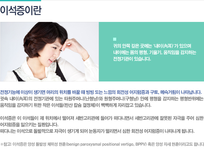 À̼®ÁõÀº ±Í ¾ÈÂÊÀÇ ÀüÁ¤±â°ü¿¡¼­ À̼®ÀÌ ¶³¾îÁö¸é¼­ ¾îÁö·³Áõ°ú ±¸Åä, ¾È±¸ÁøÅÁÀÌ ¹ß»ýÇÏ´Â ÁúȯÀÌ´Ù. À̼®(ì¼à´)À̶õ ³»ÀÌ(Ò®ì¼)ÀÇ ³­Çü³¶(Ÿ¿øÁÖ¸Ó´Ï)°ú ±¸Çü³¶(¿øÇüÁÖ¸Ó´Ï)¿¡ Á¸ÀçÇÏ´Â ÀÛÀº