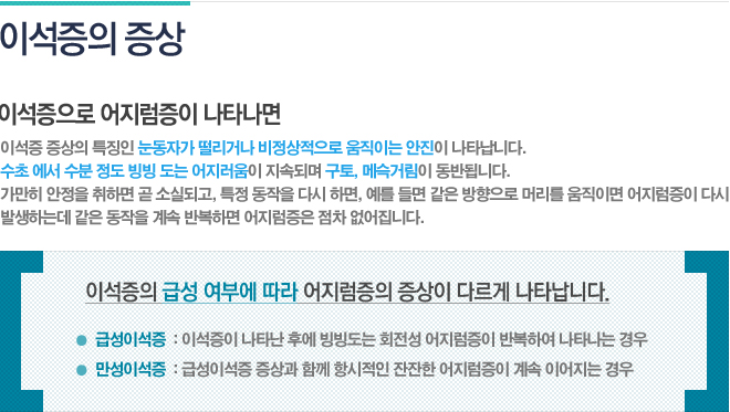 À̼®ÁõÀº ¹ßº´ Ãʱ⿡ ³ªÅ¸³ª´Â ºùºù µµ´Â ȸÀü¼º ¾îÁö·¯¿òÁõ°ú ±¸Åä Áõ»óÀÌ ¸÷½Ã °íÅ뽺·¯¿î ÁúȯÀ¸·Î À̼®ÁõÀÌ Á¦´ë·Î ³´Áö ¾Ê°í ÀÚ²Ù Àç¹ß , ¹Ýº¹Çϸ鼭 ¸¸¼º ¾îÁö·³ÁõÀ¸·Î ÁøÇàµÇ¾î ÀÏ»ó»ýȰ¿¡