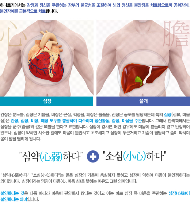 한의학에서는 장부의 불균형을 조정하여 정신의 불안정을 치료함으로써 불안장애, 공황장애를 근본적으로 치료하고자 합니다.